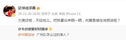 媒體人“足球徐澤鑫”寫道:“欠債還錢,天經(jīng)地義。把賬拿出來曬一曬,究竟是誰(shuí)在說假話呢?”